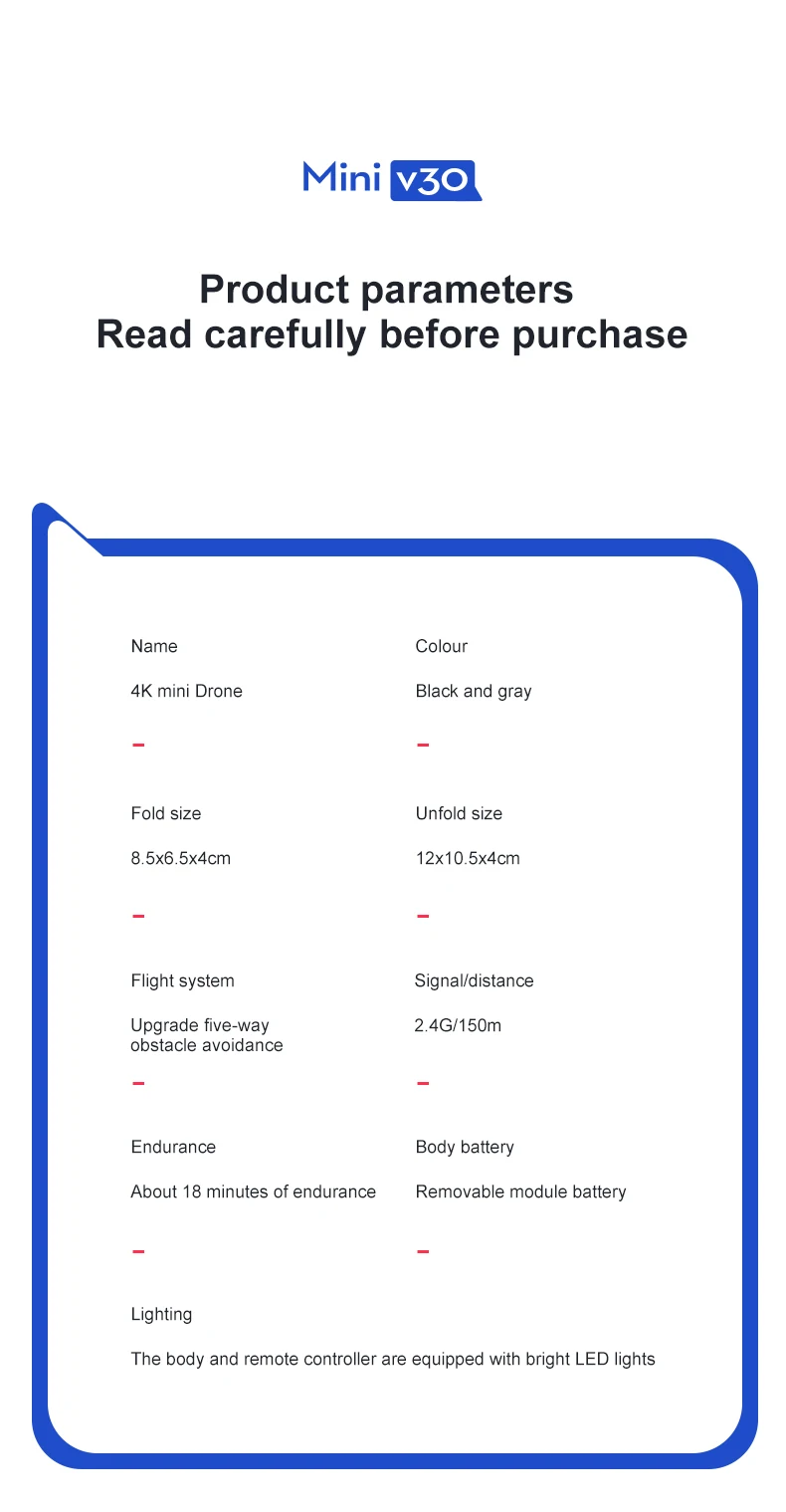 1 x V30 RC Quadcopter(Can be choose no camera/1080P/4K when order)